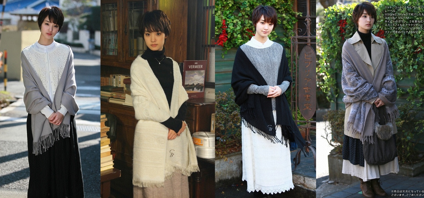 ●《古書堂事件手帖》電視劇,有否注意為配合古書屋處境,主角篠川栞子(剛力彩芽)衣著指定四式樣,全純色偏淡均配上長披肩,使觀眾感到主角有瘦長身形兼沈思的印象。 |