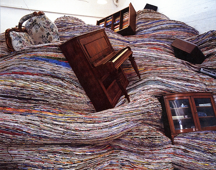 consisting of piles of newspapers or magazines carefully arranged to suggest