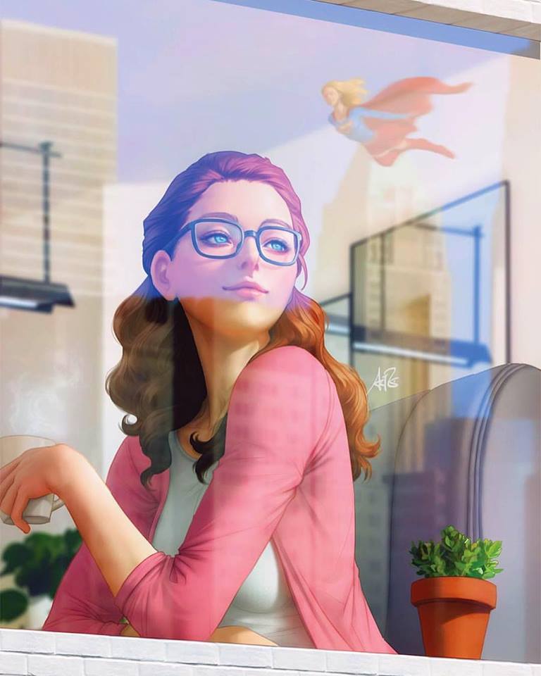 Digital art 與傳統畫作,無論技法、題材、展示等都有些分別。前者靠近商業、注重視覺反應、時代感強、多元幻境創造等。與傳統畫作著重哲理創新的美學觀,兩者似乎難於交集。 ● 但最近見到 Stanley Lau 的 Supergirl ─ Kara Danvers (美國電視劇主角),意念非常創新,存有繪畫學理上的突破。一幅 2D 畫面利用 Reflection 顯示兩幅 2D 畫面,而兩幅畫面亦擁有相關性意境的扣連,單畫面能傳遞雙畫面訊息。描述主角(被繪者)一個在室內探視一個在天空的自己,有著相關性又是現實與虛幻之間的矛盾,非常有趣,且擁有廣闊的聯想空間。Reflection 這技法在電腦繪圖方面只要按一下鍵制便可完成,但在傳統繪畫技巧就很難做到這樣的 Reflection 效果,所以從根本就沒有產生突破這種意念的創作。 |