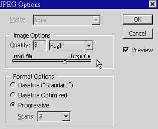Further Editing ........JPEG 壓縮方法是倚靠偵測像素的變化來壓縮圖檔的,JPEG圖檔裡沒有所謂的 256色。因此,在 L view, Pro, Photoshop 或 GIF converter 這些軟件裡開啟圖檔,會令圖像的質素下降。因此,儲存檔案時應該將原有版本儲存為 PICT 或 TIFF 圖檔,讓你能再用作編輯。若你將一個JPEG圖檔用不同的 compression levels 去儲存再儲存,圖像的質素就會一次比一次下降。因此,應該要保留一個原有的版本作後備。JPEG圖檔亦可以透過 Progressive JPEG compression 科技去下載。Netscape 亦支援這個系統,容許圖像在下載完成前的短時間內,顯示在網頁上。
