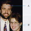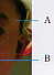 2. 白色人種皮膚的調節: 白色皮膚與黃色皮膚相同的地方就是較亮,並且膚色中M的成份會略為比Y高,這樣膚色紅潤些,同樣膚色中C和K等相反色成份也是應該有的,當然C或K的比例一定要比M和Y的低。圖二中可見A點和B點顏色分別為:A是M45%Y39%K0%,B則是C18%M32%Y32%。由此看來M和Y要比黃色人種的低。 |