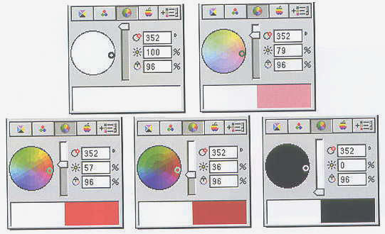 例如圖下: H=352,S=96% 的紅色在亮度變化時的顏色變化。