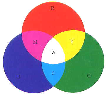 可見圖一,三個圓圈分別代表R、G、B原色,兩個圓的相交區域生成的顏色表示了兩色的混合規律。 |