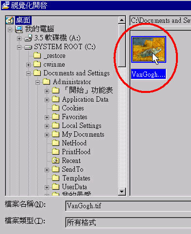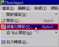 另一方面,在 PhotoImpact 內可透過一種獨特的開啟圖像方法。這種方法是『視覺化開啟』。同學可在選單上按『檔案』、『視覺化開啟』。