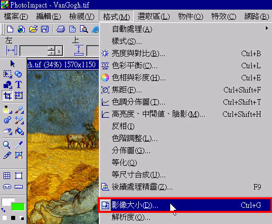 當開啟所需圖像後,接著選取選單上的『格式』、『影像大小』。