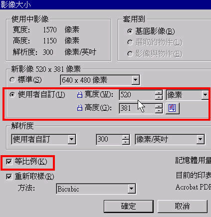 改變圖像大小時,要確定啟動了『等比例』選項,而影像大小可以控制寬度於 500 至 800 個像素之間,而啟動了『等比例』選項,高度會按寬度的大小去調節。