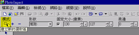 之後,移動滑鼠至上面的『屬性工具列』,將『模式』設定成『建立新的選取區』,『形狀』一項定為『矩形』,並且確定『固定大小(像素)』,將所選的矩形大小定為 130 乘 127 像素(和剛才所選的格線尺寸一樣)。