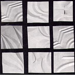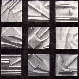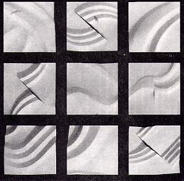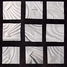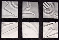 在限定的8x8厘米的正方形紙面上划出直線狀的切線圖, 然后利用條切線將紙折疊﹑彎曲﹑引拉, 使其平滑的紙面造成微量的隆起, 這些隆起和凹陷就會在光的作用下產生光影關係, 從而加強了二度紙面和三度紙面的對比關係, 就使得造型顯得含蓄﹑微妙﹑和雅緻。切線練習的形式是多樣的: 我們可以一切多折, 多折不切, 多折多切。切線的位置﹑長短﹑方向可根據構圖和形態需要而確定。